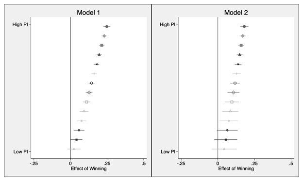 The results from the coefficient plots in Figures 2-3 provide strong support for Hypothesis 1. At the lowest levels of party institutionalization, winning has no statistical impact on satisfaction with democracy. But at the highest levels of party institutionalization, winning has a positive impact on satisfaction with democracy. Substantively, in Models 1-2, at the highest levels of party institutionalization, being a winner leads to about a 0.181 to 0.248 unit increase (or a 5% to 6% increase) in satisfaction with democracy. In Model 3, at the highest levels of party institutionalization, winners have a 32.2% probability of choosing “Fairly Satisfied” with democracy and a 15.9% probability of choosing “Very Satisfied” with democracy, while losers have a 30.0% probability of choosing “Fairly Satisfied” with democracy and a 10.3% probability of choosing “Very Satisfied” with democracy. Similarly, in Model 4, winners have a 36.0% probability of choosing “Fairly Satisfied” with democracy and a 14.6% probability of choosing “Very Satisfied” with democracy, while losers have a 33.9% probability of choosing “Fairly Satisfied” with democracy and a 10.4% probability of choosing “Very Satisfied” with democracy.