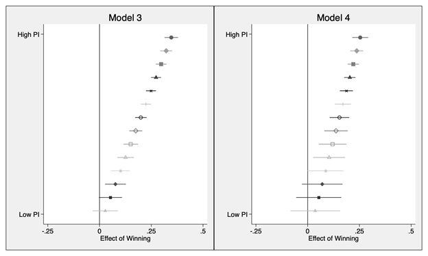 Figure 3: The Effect of Winner on Satisfaction with Democracy Conditional on Party Institutionalization, Models 3-4 (Ordered Probit)