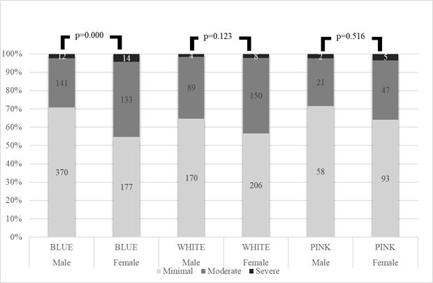 Figure 2. provides the prevalence of depression by gender among different occupational groups. Among all occupational groups, female workers exhibited higher levels of moderate and severe depression than their male counterparts. In the blue-collar occupational group, 41% of female workers experienced moderate depression compared with only 27% of male workers. In the white-collar occupational group, 41% of female workers experienced moderate depression compared with only 34% of male workers. In the pink-collar occupational group, 32% of female workers experienced moderate depression compared with only 26% of male workers.