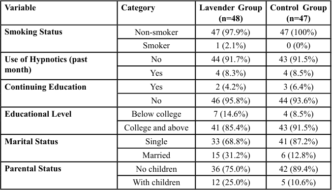 Methods: A quasi-experimental study was conducted in a hospital in southern Taiwan. Ninety-five nurses were randomly assigned to a lavender aromatherapy group (n=48) or a control group (n=47). The intervention group applied lavender essential oil to pillowcases nightly, while controls maintained usual routines. Sleep quality was assessed using the Pittsburgh Sleep Quality Index (PSQI) at baseline, week 4, and week 8, and physiological indicators of ANS activity were monitored weekly.