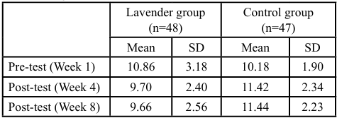 The repeated measures ANOVA revealed a significant interaction effect for time by group on subjective sleep quality, indicating that the lavender aromatherapy intervention effectively improved sleep quality over time compared to the control group (F(2,92) = 7.30, p = .001). There was a significant main effect for group (F(1,93) = 7.47, p = .000), but no significant main effect for time alone (F(2,92) = 0.07, p = .99). Post hoc comparisons showed that the lavender group’s mean PSQI scores decreased from 10.86±3.18 at baseline to 9.70±2.40 at week 4 and 9.66±2.56 at week 8, whereas the control group showed an increasing trend from 10.18±1.90 to 11.42±2.34 and 11.44±2.23 respectively (see table 2 and figure 1).