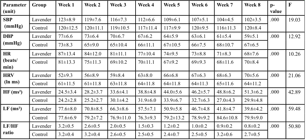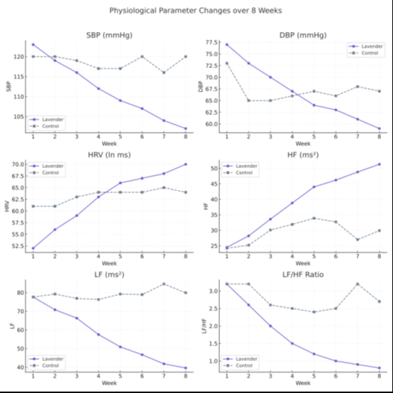 Heart rate (HR) decreased substantially in the lavender group from 87±13.4 bpm at baseline to 68±7.6 bpm at week 8 (F = 10.26, p < .001). In contrast, the control group did not show such improvement. Heart rate variability (HRV) improved notably in the lavender group, rising from 52±9.3 to 70±5.6 ln ms (F = 21.06, p < .001), while remaining unchanged in the control group.