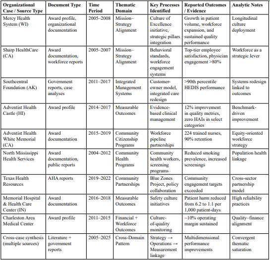 Results reflect the outputs of a structured documentary evidence synthesis rather than primary data collection. Across award documentation, government reports, and healthcare management literature spanning 2005–2025, the analysis identified a consistent set of organizational processes and reported performance outcomes associated with community citizenship among nationally recognized high performers. Directed content analysis yielded three dominant thematic domains, and cross-case synthesis demonstrated convergence in how organizations align mission and strategy, deploy community programs, and report multidimensional performance results. The sections that follow summarize the evidence base, present the thematic domains with illustrative examples, and describe cross-case patterns and limitations of the documentary record. Table 1 summarizes the documentary evidence base, linking organizational cases, document types, thematic domains, and extracted qualitative findings. The table enhances transparency by demonstrating how multiple documentary sources and organizational contexts supported thematic domains, consistent with best practices in structured qualitative document analysis [5].