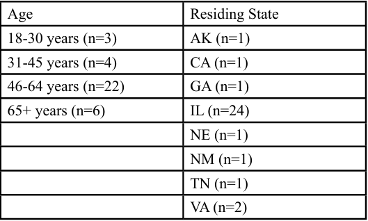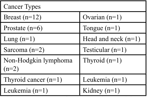 Inclusion criteria for the cancer survivor participants consisted of having a current or previously confirmed diagnosis of any cancer type within the last five years, being at least 18 years of age, and English speaking. Thirty-five cancer survivors completed the researcher developed Red Cap survey. Participants' ages ranged from 18 years to above 65 years of age and resided in 7 different states in the United States. For more detailed demographic information regarding cancer survivor participants, please see Table 1. Participants represented 15 different types of cancer (Table 2) and received a variety of oncological treatments (Table 3).