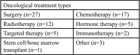 There was a wide variety of different types of cancer (n=14) and types of oncological treatments (n=10) represented by the cancer survivor participants (see Table 2 and 3 below).