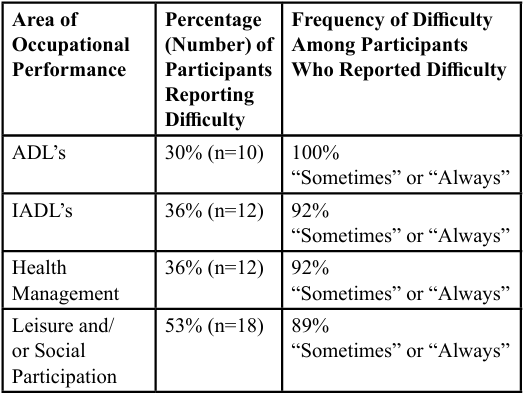 Table 4: Percentage and Frequency of Difficulty Reported with Occupational Performance Among Cancer Survivors