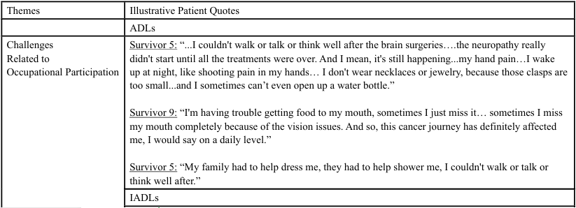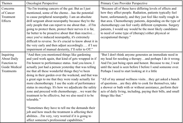 Four themes emerged from the qualitative data are: (1) Concerns regarding effects of cancer treatments; (2) Need to inquire about daily function to guide medical treatments; (3) Importance of communication and rapport; and (4) Providers have limited education on how OT can benefit patients’ participation.