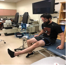 Figure 2. Knee extension exercises with Blood-Flow-Restriction implemented by the Delfi PTSII tourniquet system.