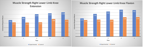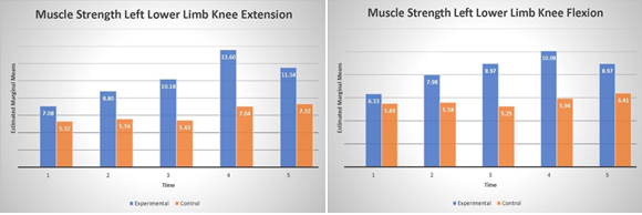 Figure 4. Muscle strength of left lower limb knee extension (panel A) and flexion (panel B) over time.