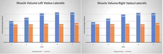 3. Ultrasonography: Cross-sectional areas of the vastus lateralis and lateral head of the gastrocnemius were measured using ultrasonography. Ultrasonography has consistently been reported as a valid tool for skeletal muscle size quantification. vastus lateralis measurements were taken as a direct reflection of muscles benefiting from the exercises performed. Gastrocnemius measurements were taken to investigate potential distal benefits. All ultrasound measurements were performed by the same researcher to enhance reliability [50].