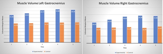 Very similar results were observed when ultrasound measurements of gastrocnemius is taken into account. The analysis showed the significant main effect of group for both right (F(1, 8) =23.12, p=.001, η2 =.74) and left (F(1, 8) =24.47, p=.001, η2 =.75) as well as main effect of time; right (F(4, 32) =16.5, p=.001, η2 =.67), left (F(4, 32) =10.38, p=.001, η2 =.56), and significant interactions between group and time for only right (F(4, 32) =6.62, p=.001, η2 =.45), see Fig. 6. The data indicates that calf volume on average increase 6.48 mm and 6.46 mm in the BFR group for right and left extremity respectively. The significant main effect of time shows that improvement is seen after 6 months of training in both extremities (all p’s<.001).