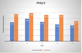 PHQ-9 showed a significant improvement over time (F(4, 32) =5,77, p=.001, η2 =.32), regardless of the group at 12-months. Interaction between group and time was not significant (p>.05).