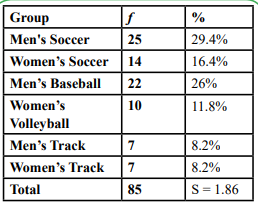 The screening process for this study was completed by 85 student athletes, which included 54 male and 31 female athletes. The testing procedures took approximately 15-20 minutes to complete per participant. The participants ranged from 18 to 24 years of age, with a mean age of 21 years. All 85 participants were enrolled as full-time student athletes and were actively participating in one of the six sports teams involved in the study. The six sports teams that athletes volunteered from to participate in this study included men’s and women’s soccer, men’s baseball, women’s volleyball, and the men’s and women’s track teams.