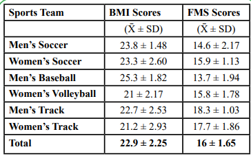 The data from this study were recorded in an Excel spreadsheet and analyzed using SPSS software. Both BMI and FMS scores were collected using the proper execution of instrumentation and procedures. The data for both tests were first recorded by hand using an FMS Score Sheet (Appendix C), which provided space for the FMSC rater to record height, weight, and score all seven of the exercises involved in the FMS protocol [27]. This data was then transferred to an Excel spreadsheet, where BMI scores were calculated using the recorded weight and height measurements and the standard BMI formula. The resulting BMI scores for each participant were then categorized according to the standard percentages set by the World Health Organization’s (WHO) International Classification of Adult Underweight, Overweight and Obesity According to BMI [43] chart (Appendix A). The recorded FMS scores were also categorized according to the pre-determined passing score of 15 out of a possible 21 points [44]. Mean values and standard deviation for the BMI scores and FMS scores were calculated and recorded separately for each participating sports team. The percentages of scores for all of the mean values were recorded in tables representing each descriptive category.
