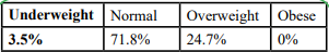 The mean values from the overall results of all 85 participants were used to calculate the percentage of scores for each BMI category. The mean underweight category made up 3.5% of the population, the mean normal category was 71.8%, and the mean overweight category was 24.7% of the population tested. There were no obese scores for any of the population tested in this study. Table 3 reveals the overall percentage breakdown of the four BMI categories as described.