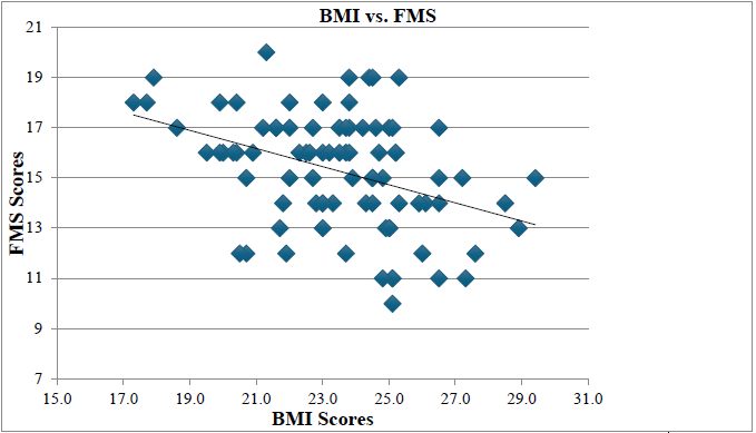 Assessing injury risk and movement proficiency has also been compared using various body analysis and composition techniques [20]. Most research supports the fact that BMI is not the best tool for assessing athletic populations since it is not an analysis of actual body composition; it does not assess lean mass versus fat mass [38]. Some research supports the use of abdominal circumference as a better choice over BMI in determining risk of musculoskeletal injury [39]. However, this study proposed the effect of overall mass on potential movement deficiencies, rather than the risk of injury in sport.Therefore, the impact of BMI as a predictor of injury based on the accuracy of assessing specific body composition was not in question. Russell and colleagues [40] researched the effectiveness of using BMI to predict body fat in female collegiate athletes, and the results suggested that excess mass often resulted in poor performance in sports that required optimal movement proficiencies which supports the research design presented in this study design. Furthermore, Joshi and colleagues [41] found that BMI scores were effective in determining trends in fitness scores in schoolchildren. While BMI does not have the best reputation for assessing athletic populations, research findings do indicate there is plausible reliability in determining trends between movement ability and body mass as determined by BMI scores [41,20]. This study was designed to determine if a relationship exists between BMI and FMS scores amongst collegiate athletic populations.