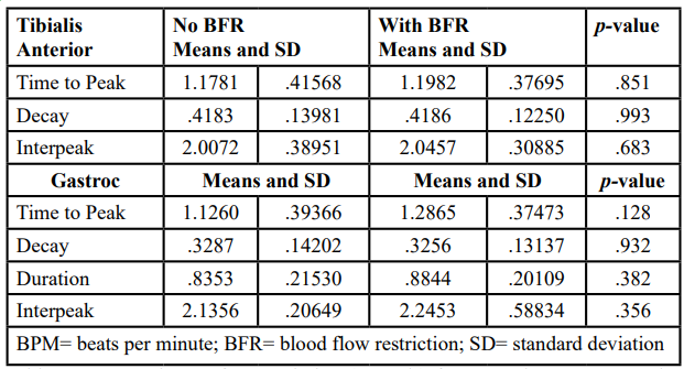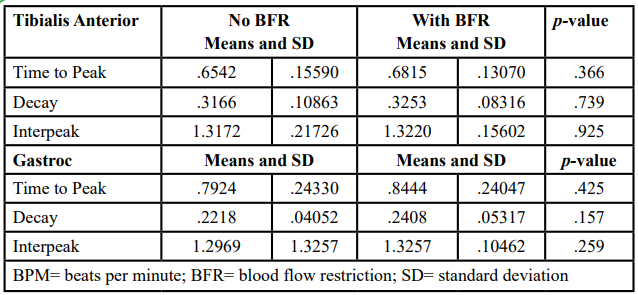 Statistical Analysis: A 2x6 (BFR group and muscle) repeated measures multivariate analysis of variance (MANOVA) tested for significant interactions and main effects during each speed and BFR condition. The time to peak, decay, and interpeak EMG values are presented for each muscle pairing.