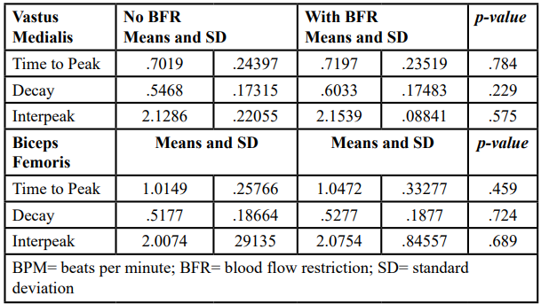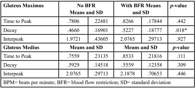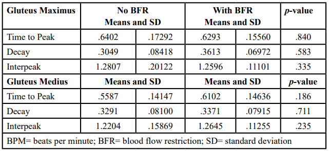 Conclusion: At 80 bpm, BFR affected the GMax regarding EMG decay. At 140 bpm, BFR significantly affected the biceps femoris, with increased interpeak values due to BFR. Rehabilitation specialists can use these findings to accurately target GMax and biceps femoris activation patterns with BFR use, most notably using shorter training intervals to reduce fatigue.