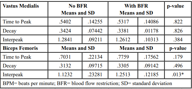 Results: Statistical analysis of the MANOVA revealed significant decay at 80 bpm with GMax regarding BFR (p=.018). Also, the nter peak of the at140 bpm (p=.013) for the biceps femoris.