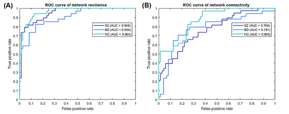 Region-based network resilience reflected the topology of the brain network, and as relevant studies have demonstrated, the brain network of SZ and random network showed closer similarity in network resilience [17]. When we simulated a targeted attack on brain regions in the descending order of betweenness centrality through resilience analysis, removing nodes caused brain networks to become more fragmented if there was apparent hub connectivity in the networks. Because the topology of hub connectivity is more disrupted in SZ than in BD, resilience analysis could be used as a tool with great accuracy, high sensitivities (0.83 in SZ and 0.82 in BD) and specificities (0.90 in SZ and 0.90 in BD) for differentiating SZ from BD.
