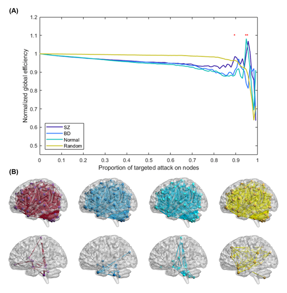 Figure 4. Network resilience of schizophrenia (SZ; purple line), bipolar disorder (BD; blue line), healthy control (HC; green line), and Erdös–Rényi random network (yellow line). (A) The normalized global efficiency of each group changed with increasing proportions of targeted elimination on nodes. During the targeted attack, the brain regions were eliminated in descending order of betweenness centrality, one region at a time. Once an additional region was eliminated, the normalized global efficiency of all the networks was recalculated. The normalized global efficiency was computed by dividing the global efficiency of the residual network by the global efficiency of the unattacked network. Red asterisks indicate significant differences in normalized global efficiency between the three groups using analysis of variance with false discovery rate correction (q< 0.05). (B) The glass brain illustrates the connectivity after eliminating 88.8% of nodes in the networks of SZ, BD, and HC, and the random network.