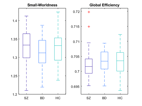 Figure 5. Boxplot of the small-worldness and global efficiency of the three groups, which were used to show global patterns of network topology. Both of these properties exhibited no significant differences between the three groups (p> 0.05). SZ: schizophrenia; BD: bipolar disorder; HC: healthy control.