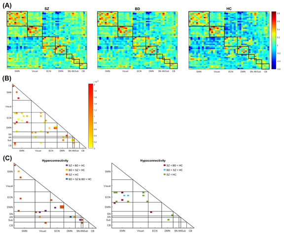 Figure 6. The connectivity within and between the somatomotor network (SMN), visual network (Visual), executive network (ECN), default-mode network (DMN), salience network (SN), auditory network (AN), subcortical regions (Sub), and cerebellum (CB). (A) The intra- and inter-network connectivity of the three groups; the color bar represents the z-score of the correlation. (B) The connections differed between the three groups according to an analysis of variance corrected by false discovery rate (q< 0.05); the color bar represents the intensity of the p-value. (C) Left: The connections with significantly increased connectivity in the patient groups compared with the control group using Bonferroni post-hoc test. The altered connections of SZ are located in DMN-ECN, DMN-SMN, AN-cerebellum, and visual-cerebellum, and those of BD are located in SN-visual, AN-visual, DMN-ECN, and DMN-visual. In addition, hyperconnectivity within the network is exhibited in SMN with SZ > HC and SZ > BD > HC, as well as in ECN with SZ > HC. Right: The connections with significantly decreased connectivity in the patient groups compared with in the control group using Bonferroni post-hoc test. The altered connections of SZ are located in SN-DMN, SN-ECN, and ECN-SMN, and those of BD are located in SMN-DMN, SN-ECN, and ECN-SMN.