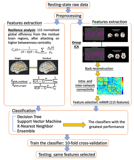 Figure 1. Overview of the classification process. After preprocessing resting-state functional magnetic imaging data, two approaches to feature extraction were used: group independent component analysis (ICA) and resilience analysis. The resting-state data of healthy controls were decomposed into 75 components; then, the back-reconstruction method was used to estimate the spatial maps and time courses of all participants. Time courses of 43 components, which were identified as intrinsic connectivity networks, were used to compute the intra- and inter-network connectivity. Minimum-redundancy maximum-relevance feature selection was used to select 115 features from a total of 903 connections. Then, 115 normalized global efficiencies were classified after targeted elimination, and 115 intra- and inter-network connections were trained separately to select the optimal classifier.