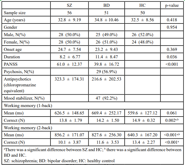 According to the demographic data, no significant differences existed in terms of age or sex across the three groups as well as in terms of age at onset between the two patient groups (Table 1). However, significant differences were observed in terms of duration, which could be the result of only patients with SZ being those in a stable phase. The total PANSS scores were significantly different between the SZ and BD groups (including 29 patients who had psychosis). Furthermore, the three groups did not differ significantly in terms of mean response time in the 1-back working memory test but differed significantly in terms of correct number in the same test as well as in mean response time and correct number in the 2-back working memory test (p<0.05). Pairwise differences were investigated using Bonferroni post-hoc analysis, and results showed that significant differences existed between the SZ and HC groups as well as between the BD and HC groups. This indicated that both the SZ and BD groups had poorer working memory than did the HC group, especially in the more difficult task; however, the two patient groups showed no significant difference.