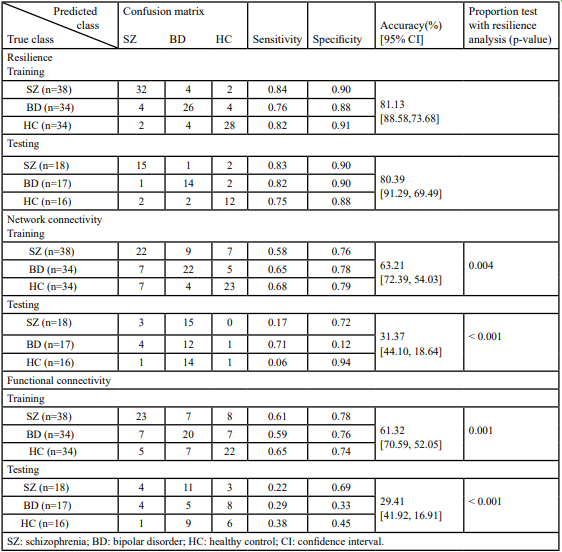 Table 3. Ensemble (subspace discriminant) classification of resilience analysis, and intra- and inter-network connectivity both by using group independent component analysis (gICA)