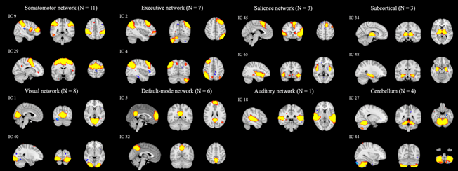 Figure 2. Thresholded spatial maps of 43 intrinsic connectivity networks were classified into eight networks. Each network is exemplified by one or two components.
