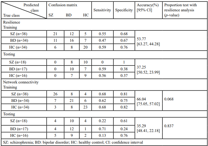 Because the organization of hub connectivity has been found to be we hypothesized that resilience analysis provides a novel approach more aberrant in patients with SZ than in those with BD [13,21,22], to classify these two highly similar neuropsychiatric disorders. Furthermore, we hypothesized that resilience analysis has the potential to be a robust and reliable differentiation tool for diagnosis. The aim of this study was to explore whether differences in the global characteristics of brain functional networks between SZ and BD can be used in diagnosis using resilience analysis.