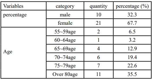 The subjects of this study are the elders from Taitung aboriginal tribes who have been registered at the Cultural Health Center. According to regulations, the senior citizen of a tribe is 55 years old or above. Selected 2 tribes for course intervention, totaling 42 people. Following the 12-week intervention, 31 participants (21females and 10males) completed both Paired Samples T-Test. The mean age was 75.87 ± 8.89 years, with the following age distribution: 55-59 years (n=2), 60-64 years (n=1), 65-69 years (n=4), 70-74 years (n=6), 75- 79 years (n=7), and 80+ years (n=11). (Table.1)