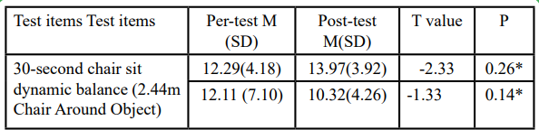Post-test results showed significant improvements in both the 30-second sit-to-stand test and the 2.44-meter timed up-and-go test (p< .05)(Table.2), indicating enhanced lower limb muscle strength following the 12-week intervention. These findings align with previous studies [15-17]. Confirming the effectiveness of walking sticks in strengthening lower limbs.