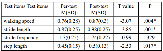 Post-test results demonstrated significant improvements in walking speed, stride length, and step length (p< .05)( Table.3), Only the stride frequency is not significant. These findings are partially consistent with previous studies [8,18-21].