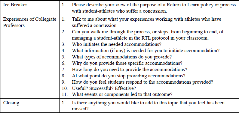 Managing the cognitive load of a student’s recovery from a concussion is a vital and growing component of the overall care for students who suffer this injury. Recommendations in the literature, requirements from the NCAA, and current educational practice have encouraged Athletic Trainers to create policies and procedures for RTL in addition to RTP. Creation of these RTL policies should be a collaborative approach, valuing the opinions and considerations of all major stakeholders responsible for implementing care for students [22]. Collegiate professors play a direct role in the RTL process as the facilitator of their academic accommodation, an important pillar to facilitate positive outcomes and healing from a brain injury. If collegiate professors are going to be a pillar in the RTL process and trusted to provide necessary accommodations, then their experiences in providing the necessary accommodations in the RTL is a critical phenomenon to investigate.