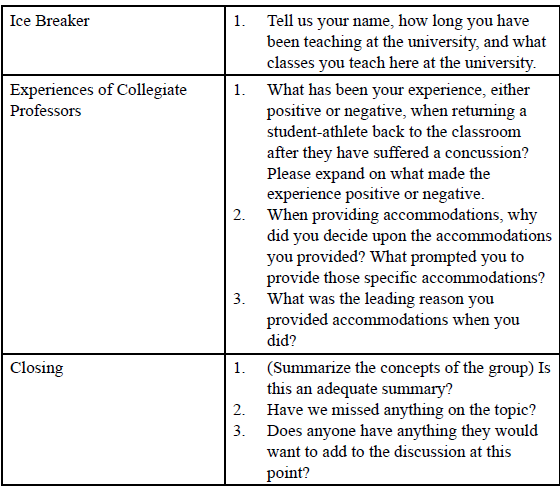 A two-prong phenomenological approach was used to complete this study. Qualitative semi-structured interviews and a focus group were administered and analyzed to evaluate the experiences of collegiate professors in providing academic accommodations to students who had suffered a concussion.