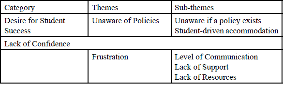 Results: Findings promoted three major themes: Unaware of Policies, Lack of Confidence, and Frustration. Secondary themes identified deficiencies in communication, unprovided resources, and a lack of knowledge of concussion policy. All themes frame the various struggles and frustration professors have experienced when providing accommodations to students suffering a concussion.