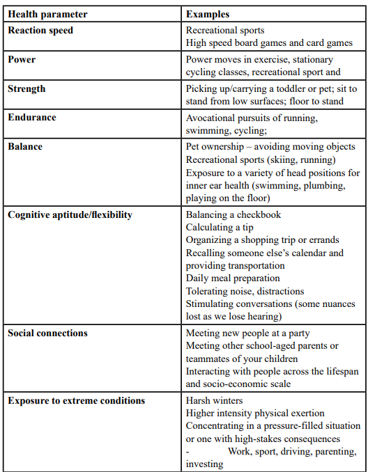Table 1: provides insights that may be helpful for your own life. You may see activities that people commonly stop doing as they age may in fact be the precipitant or accelerate some of the losses that we blame on age. Some of these activities are stopped because the person who is aging is no longer engaged in them. This is the case for work for a lot of people. Some activities are stopped because society tells us that “people that age” don’t “do that” (bike, run, ride skateboards). Most importantly, use this table to check yourself. Check your beliefs that you impose on yourself and those you pass on to others.