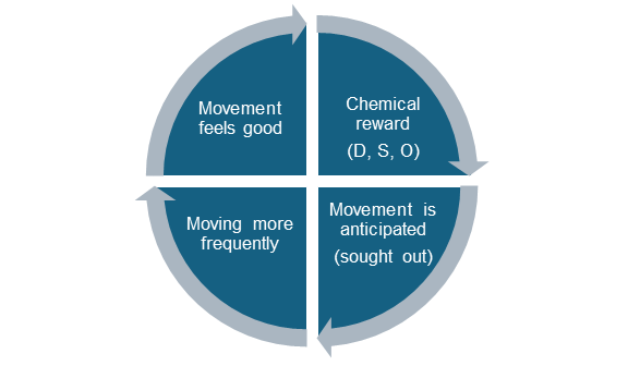 When the brain has chosen to exert the body, we can feel a sense of wellness that is largely chemically based (neuromodulators and signaling molecules). When your chosen form of physical activity provides a sense of reward, a person is more likely to seek out that sensation again in the future. With repeated pleasant experiences, we create associations with PA (event based or episodic memories) that feel successful or productive (raked leaves, scored a goal, walked the dog, helped to build a play structure). These associations become connected in the brain, initially through a chemical reward, and later through new connections in the brain, learning, neuroplasticity.These connections and the downstream chemical responses (“physical activity gives me purpose”) can create a positive or virtuous cycle through this reward system. A simplified version of this is represented in Table 2. This positive cycle includes virtuous, as participation (being physically active) which can increase the desirable sensation (endorphin, reduced sense of depression), thereby giving the mover some reason to continue, as well as reason to seek this out again. This movement to sensation to memory loop can help to reinforce our choices, forming both habits and an identity that can lead to more consistency. Consistency is an important part of exercise and all forms of PA, leading to fitness and respecting tissue hygiene. If we are rarely active, but very intense when we move… injury becomes more likely. However, when engaged in movement that is enjoyable or purposeful, we can expect to devote greater intensity, attention, and the all-important attendance (consistency). These attributes may yield greater outcomes, thereby increasing our sense of attachment and reward to the activity – a virtuous cycle as depicted in Figure 1.