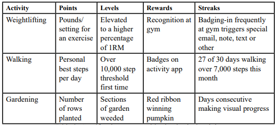 The most widely recognized means of gamification come in the forms of points, levels, rewards, and streaks. Table 3 provides examples of each, within the context of PA.