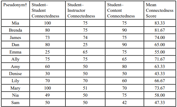 Participants’ reflections largely mirrored their self-rated connectedness scores, which consistently showed stronger bonds with peers and content than with faculty, highlighting the importance of intentional instructor presence. To further illustrate the relational dynamics, Table 2 presents participants’ self-rated levels of connection with peers, instructors, and course content.