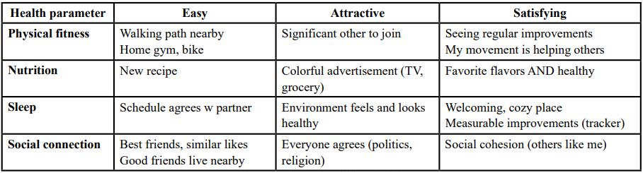 We are chiseled into our best shape, physically and mentally, by the intentional and occasionally very difficult work that we do to improve. This intentional and hard work can come in the forms of reshaping habits, committing to healthier lifestyles, and consistently investing in preparatory work to hone a skill, capacity, or talent. We are more likely to stay the course when this work is convenient (easy, nudged), tempting (rewarded or accomplished with others), and satisfying (rewarded just frequently enough to see the gains). Table 1. provides real-life examples of these three principles (easy, satisfying, attractive) in physical fitness, sleep, nutrition and social connections.