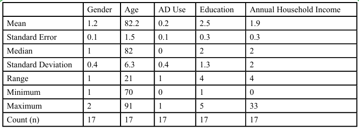The sample consisted of 18 participants (n=18) with 13 females and five males aged 70-91 years with an average age of 82. One participant was excluded from the study after disclosing a history of Parkinson’s during data collection. The final sample size was n=17 with 13 females and four males. The education received ranged between high school, some college experience and an associate's degree. This includes three participants with some college experience, five participants with a high school Diploma or GED equivalent, five participants with an associate’s degree, three participants with a bachelor's degree, and one participant with a master's degree. Although the survey included a question on annual household income, the data were limited in quality and completeness. Several participants reported uncertainty about their household income and provided only estimated guesses. Among the 15 participants who were able to answer the current annual household income question, responses varied: seven reported incomes between $25,000–49,999, four between $50,000–74,999, three reported less than $24,000, and one reported $75,000–99,999. Due to the limited sample and reliability concerns, income data were not used in the final analyses. As a result, education level was used as the primary SES indicator in this study. Future research should seek to capture more comprehensive and validated SES data, including income, occupational status, and neighborhood indicators, to more accurately assess the relationship between socioeconomic factors and fall risk.