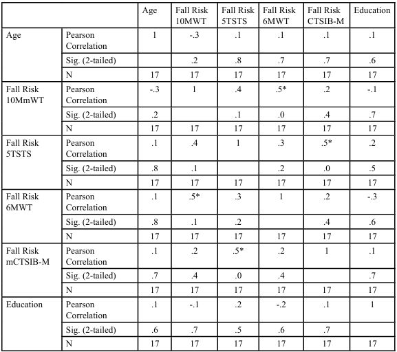Conclusion: Fall risk associated with scores of the 6MWT and 10MWT were found to be significantly correlated, indicating a positive relationship regarding walking speed and walking endurance in this patient population. Fall risk associated with scores of the 5TSTS and CTSIB-M were found to be significantly correlated, indicating a positive relationship regarding quadriceps strength and functional balance in this population. No significant correlations were found regarding education, age, current income and the outcome measures tested in the study.