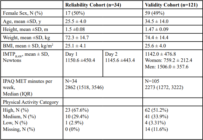 One hundred nineteen participants completed the full testing session with 34 returning for a second day to establish test-retest reliability. Participant demographics are described in TABLE 1 for each cohort. Non-normalized IMTP values in Newtons are presented for comparison to the existing literature. The IPAQ was added to the protocol after the first 10 participants. An additional 6 participants did not provide sufficient data to calculate metabolic equivalents. Therefore, only 105 participants sufficiently completed the IPAQ. Eighty-five percent of participants were classified as having a medium or high activity level.