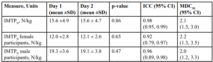 To establish test-retest reliability, IMTPN from the first session was compared to IMTPN from the second session using a two-way random effects intraclass correlation coefficient model (ICC2,1). In addition, a minimal detectable change score (MDC95) was calculated from the standard error and ICC at a 95% confidence interval (CI) for IMTPN.