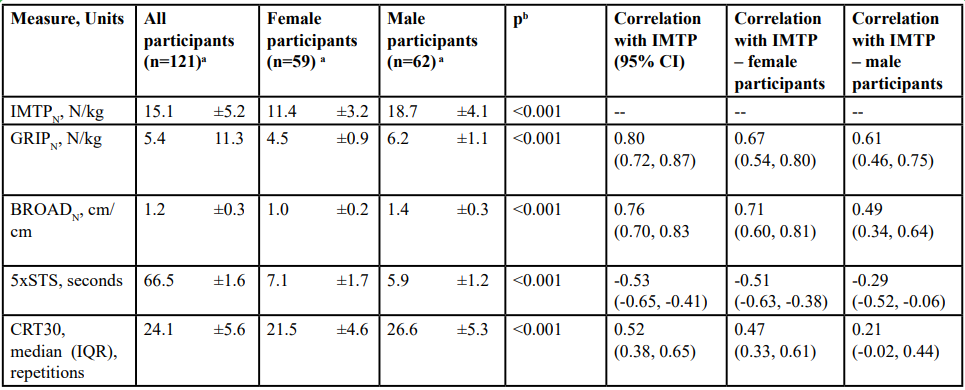 To establish the concurrent validity of the IMTP as a measure of total body strength, IMTPN was compared to GRIPN, BROADN, CRT30, and 5xSTS using simple correlations with 95% CI. Correlations greater than ± 0.8 are considered very strong, between ± 0.6 and ± 0.8 moderately strong, ± 0.3 to ± 0.6 fair, and between 0 and ± 0.3 are considered poor [24]. Because we expected differences between sexes, we also investigated sex-specific correlations for each measure.