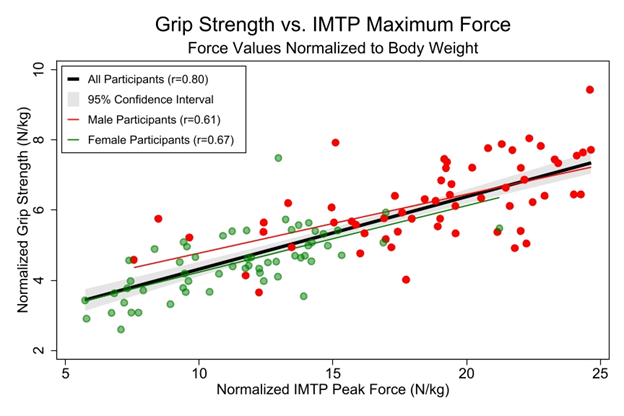 Figure 2. Grip strength vs. IMTP maximum force. This figure illustrates the strong correlation between grip strength and the IMTP for the whole sample, while the correlations within sex are weaker. Within sexes, there are fewer overall participants, so extreme values affect the correlation to a greater degree. This is best seen by the highly variable grip strength among males with IMTPN less than 15N/kg.