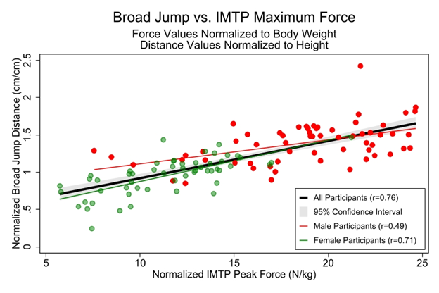 Despite the poor correlations within sex, the linear regression model that included sex as a predictor of IMTP was still very strong. We assessed the relationship between the IMTP and comparator tests with a linear regression as the IMTP incorporates aspects of all the comparators. To perform well on the IMTP, an individual needs well-developed leg strength and power, as well as a strong grip. Therefore, we hypothesized that individuals who performed well on many of the comparator tests would perform well on the IMTP. In general, this relationship held up. A combination of the predictors and sex explained 73% of the variance in IMTP performance, which was vastly superior to any single measure, supporting the multifaceted nature of the IMTP.